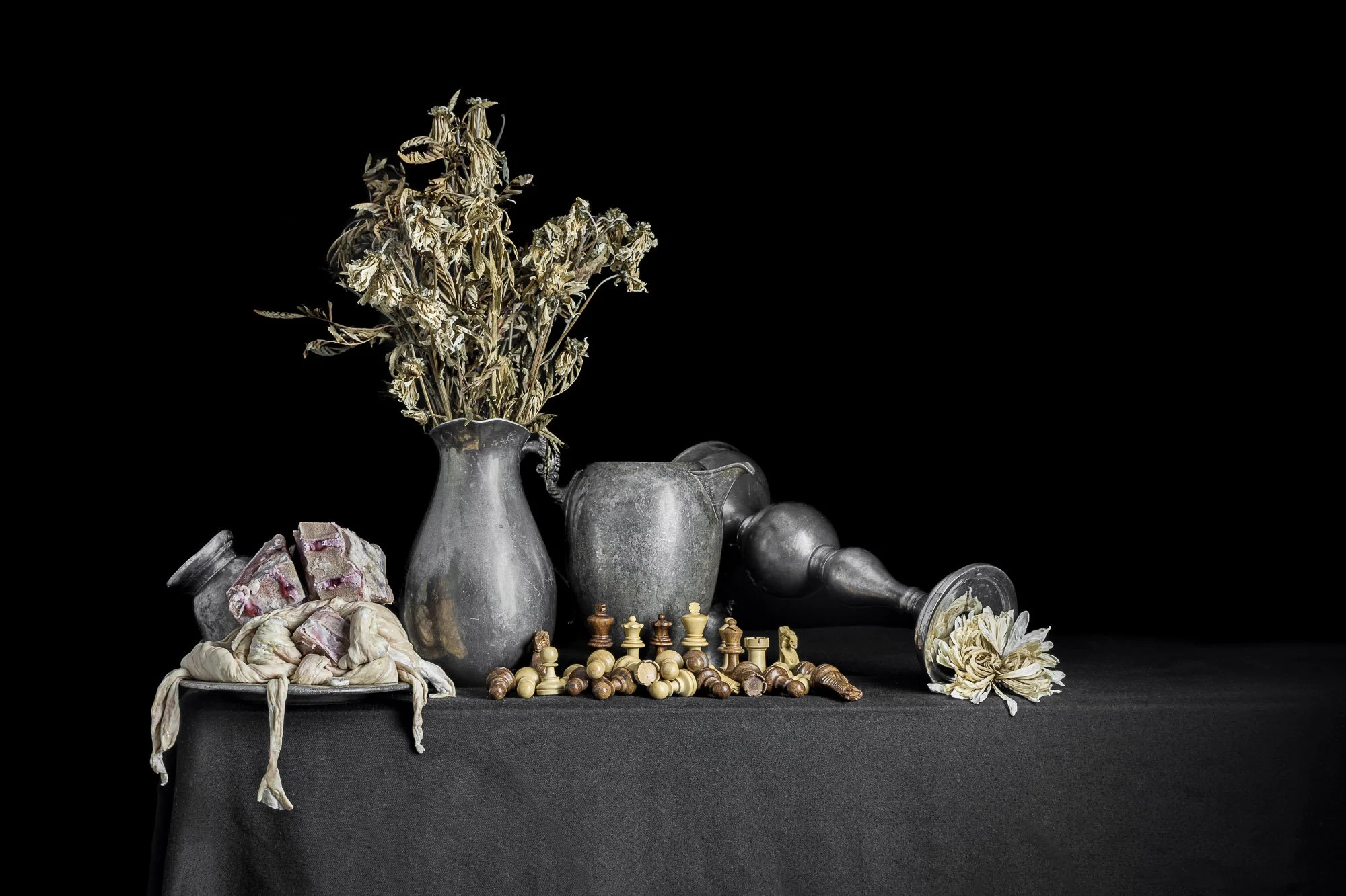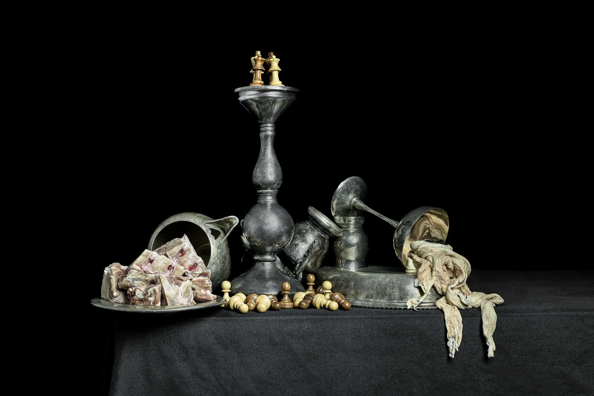 This series of Vanitas compositions explores the idea of chess as a metaphor for both life and war. Precariously placed goblets, extinguished candles, and dead flowers suggest the brevity and uncertainty of life. Although bones have been my go-to choice of memento mori lately, here it seemed more fitting to opt for gore and intestines, echoing the idea that those who fight our wars are sometimes seen as little more than meat by the handful of powerful elites pulling the strings. The cross draped in gore nods to the perverse and disingenuous ways that rulers throughout human history have sought to rationalize and justify their vain pursuit of power. Echoing De Poorter, I have conspicuously placed the higher status pieces at a remove from the pawns. In one image, the kings and queens tower high above the fallen pawns—a reminder that those who start wars rarely face their consequences.